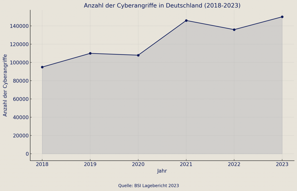 Die Bedrohung durch Cyberangriffe nimmt weltweit stetig zu, und Deutschland bildet dabei keine Ausnahme. Die folgende Grafik veranschaulicht die Entwicklung der Anzahl der Cyberangriffe in Deutschland von 2018 bis 2023. Sie zeigt einen signifikanten Anstieg der Angriffe, was die Dringlichkeit unterstreicht, effektive Sicherheitsmaßnahmen zu implementieren und auf dem neuesten Stand der Cyber Security zu bleiben. Laut dem BSI Lagebericht 2023 sind die Bedrohungen durch Cyberkriminelle so hoch wie nie zuvor, wobei besonders Ransomware-Angriffe zunehmen. Bleib informiert und schütze dich – unser Ratgeber bietet dir die notwendigen Werkzeuge und das Wissen, um sicher durch das digitale Zeitalter zu navigieren.